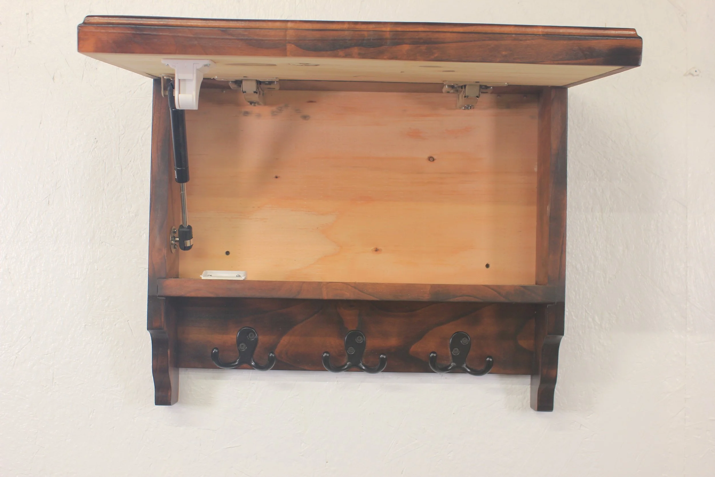 concealment box with bear engraved cover, soft close hinges, hydraulic support arm, magnetic safety lock, candle base with magnet installed in the bottom to activate the lock. knotty pine or maple construction depending on material availability, finger joint top construction and dadoes for the bottom while the back is recessed to accept French cleat hardware for flush mounting to the wall.