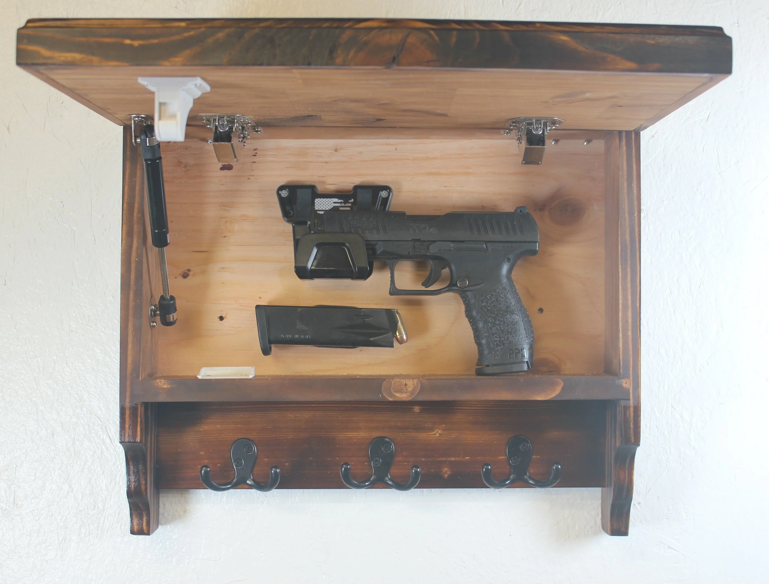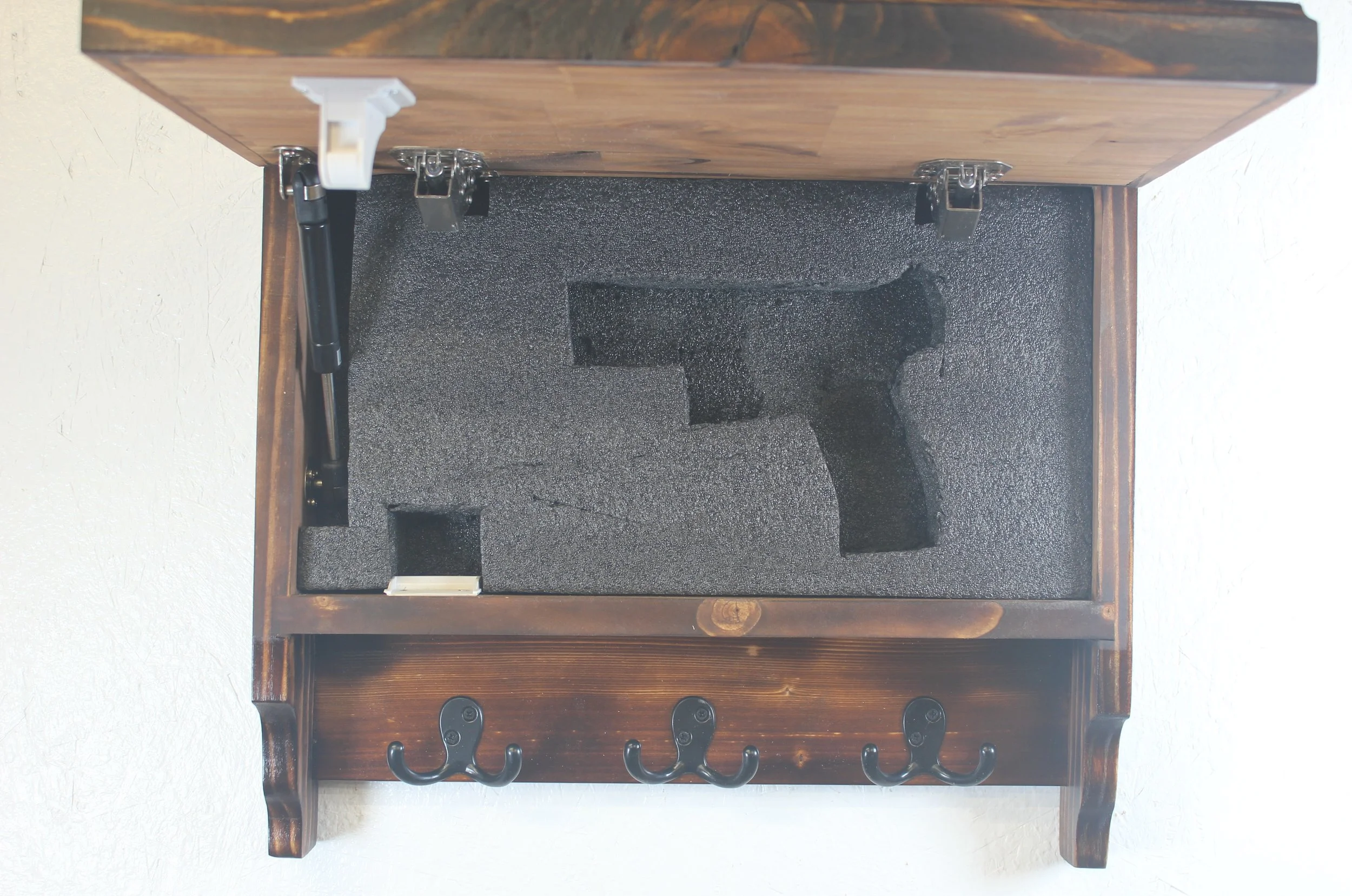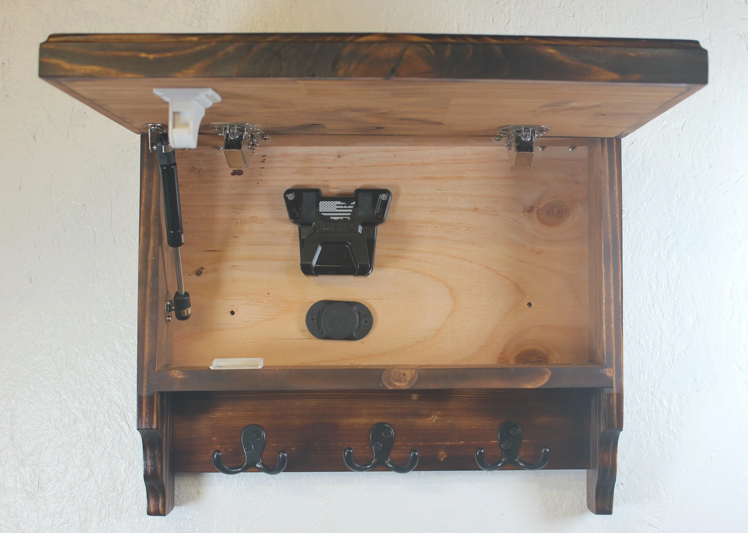 Bear engraved door, soft close hinges, hydraulic support arm, magnetic lock with magnet in the bottom of a candle base to activate the lock. constructed from pine or maple with finger jointed top and dadoes for the bottom. the back is recessed to allow for French cleat hardware to mount tight to the wall.